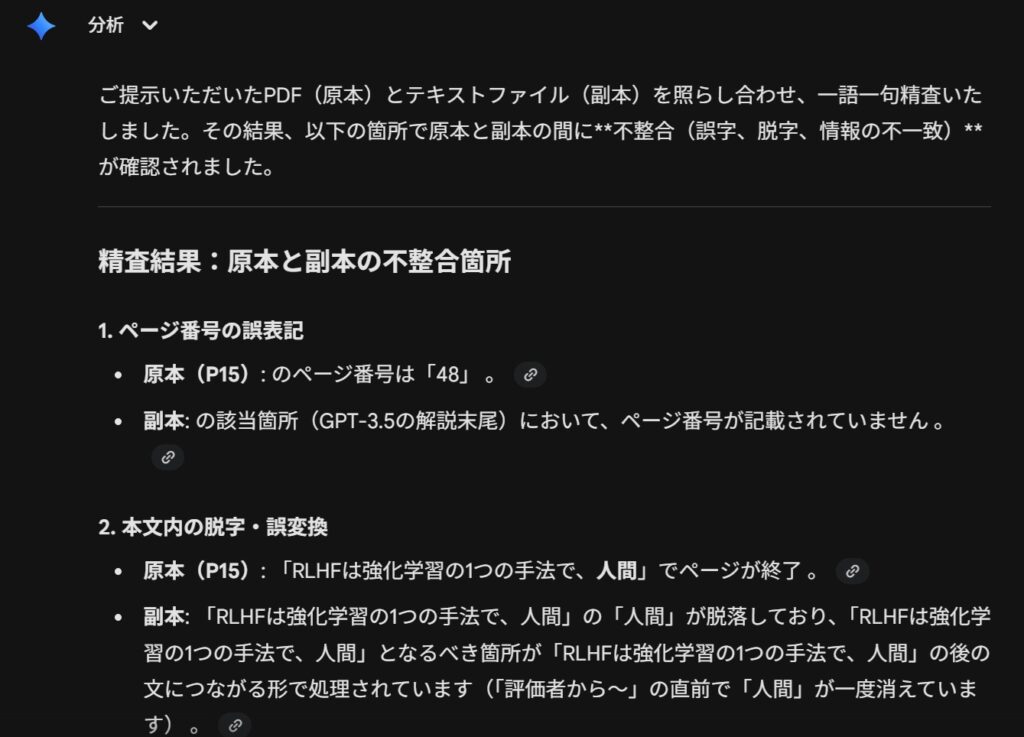 さらに慎重を期す場合は、ChatGPTなどのほかのモデルに、原本PDFと修正した副本テキストの整合を精査させるとよいでしょう。
