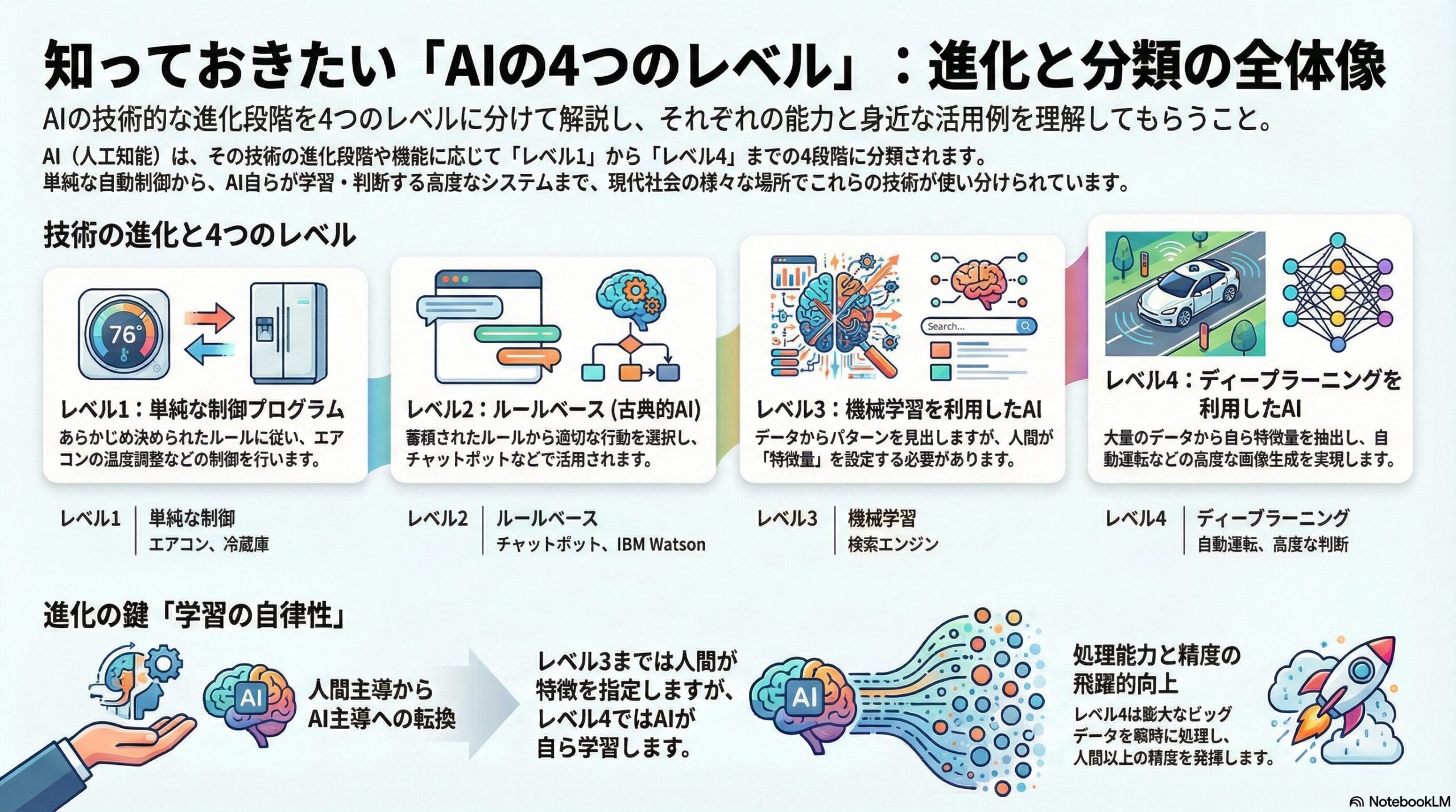 AIを次の4つのレベルに分けて説明しているよ。